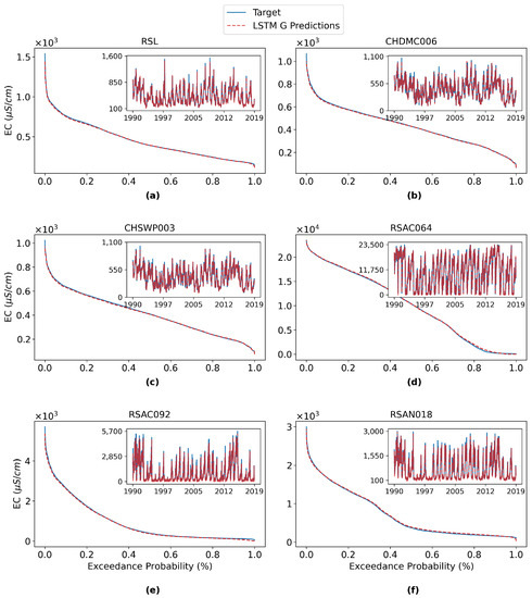 In addition to the statistical metrics, the specific daily salinity simulations from the proposed models are compared to the corresponding target salinity. For demonstration purposes, the results from the grouped LSTM model are presented at six selected locations in the form of exceedance probability curves and time series plots. These locations include three intake locations where water is pumped and transferred to various users to meet different needs: CCWD Rock Slough (RSL; location #28 in Figure 1), CVP Intake (CHDMC006; location #23), CCFB Intake (CHSWP003; location #22). Two important salinity compliance locations: Emmaton (RSAC092; location #1) and Jersey Point (RSAN018; location #5) are also included. The last location is the Sacramento River at Port Chicago (RSAC064; location #4) of which some of the metrics for an extremely high range of salinity are not as desirable as their counterparts for other locations, as previously noted in Figure 9.