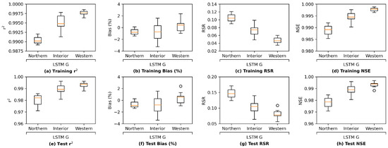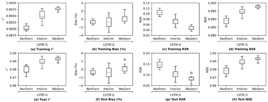 Box and whisker plots of four types of metrics consisting of , percent bias, RSR, and NSE on stations belonging to the northern, interior, and western Delta groups during the training (panels (a–d)) and test (panels (e–h)) phases of the grouped (G) LSTM model.