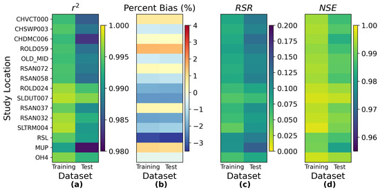 Model (grouped LSTM) performance measured by (a) , (b) Percent Bias, (c) RSR, and (d) NSE on training and test datasets at the study locations belonging to the Interior Delta group.