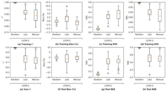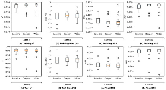 Box and whisker plots of four types of metrics consisting of , percent bias, RSR, and NSE during the training (panels (a–d)) and test (panels (e–h)) phases of the grouped (G) and ungrouped (UG) LSTM models under five scenarios: baseline and four different memory lengths as presented in Table 1.