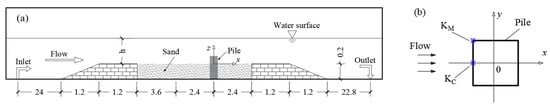 Test flume and coordinate system modified from Du and Liang [], unit: m, (a) Side view of the flume, (b) Sketch view of KM and KC points.