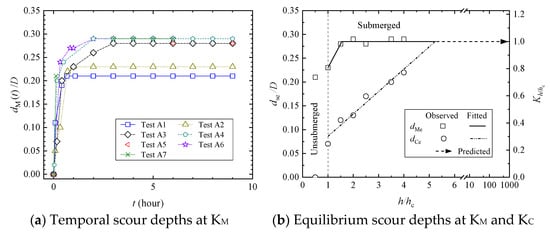 To study the influences of flow depth on local scour, unsubmerged (Test A1), transitional Test A2 and submerged cases of Test A3–A7 were investigated. In the process of these tests, scour depths at KM were observed much deeper than those at KC (see Table 1). These differences are probably owed to the larger bed shear stress at KM than at KC, as Roulund et al. [] found that the bed shear stress at the upstream lateral side of the pile was 7 times that of the symmetry upstream of the pile in a numerical simulation test with the Froude number of 0.14. Thus, scour always started at the upstream corners of the pile in clear-water scour conditions [,]. Because the scour depth evolution trends at KM and KC were similar, scour depths at KM were discussed as an example. As presented in Figure 2a, each test was carried out for 9 h to get its equilibrium scour state at KM. The scour depth evolution curves appeared to be asymptotic, i.e., scour depths increased rapidly in the initial scouring phase, slowed down in the developing phase, and kept at a constant value in the equilibrium scouring phase.