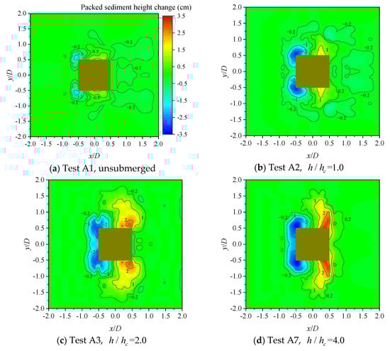 To describe the influences of flow depth on sand scour and deposition distributions, examples of three-dimensional topographies, unsubmerged Test A1, transitional Test A2, and submerged Tests A3 and A7, are presented in Figure 3a–d, respectively. They show that the sizes of scour holes upstream and the heights of deposited sands in the lateral sides of the unsubmerged case were much smaller than those of the submerged cases, respectively. The significant erosion behind the pile in transitional Test A2, which was induced by the mixing of separated flow from the top and the separated flow from the sides [], was much larger than the others. Because the angle of static repose under water is constant for the sand, there is no doubt that a larger scour depth is related to a wider hole. As seen in Figure 3, the scour hole diameters of Tests A1, A2, A3 and A7 were about 0.25D, 0.35D, 0.5D and 0.5D, respectively.