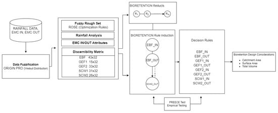 The framework of this research is based on the paper of Sumalatha et. al. [26]. To generate reducts and produce decision rules for forecasting the decision class, researchers employed a rough set-based approach. Figure 1 depicts how decision rules were formulated in the study as the basis for the bioretention design considerations. The data set was derived from the daily records of rainfall amount over thirty years for Cheonan City, Korea. With this range of rainfall values, the fuzzy classifiers method was assigned for the class label [27]. Weibull (Equation (1)) percentages with related precipitation depth were used to assign fuzzy classifiers to rainfall events depending on their intensity. The percentile occurrence frequency of rainfall, which was dependent on the class label, was the object to forecast in the study. The bioretention areas were monitored distinctively resulting in 43, 15, 33, 31, and 26 event mean concentrations for EBF, GEF1, GEF2, SCW1, and SCW2 bioretention, respectively. The entire depth of each rainfall observation event was classified uniquely by assigning a fuzzy value to it. The decision rules were examined using empirical testing.