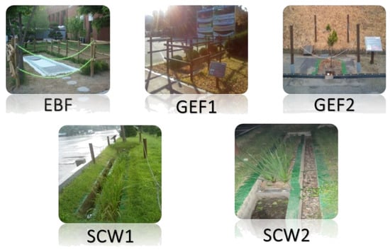 Table 2 summarizes the five bioretention characteristics. It includes the land use/run-off source, infiltration capability, vegetation, catchment area, ground slope, aspect ratio, surface area, total volume, storage volume, and the total cost. The five bioretention areas vary in terms of land use and run-off source, infiltration capability, presence of vegetation, catchment area, ground slope, surface area, total volume, storage volume, and total cost. The Eco-biofilter (EBF) site has a total catchment area of 520 m2, surface area of 5 m2, total volume and storage volume of 6.5 m3 and 3.85 m3, respectively. The area is a road devoid of vegetation, able to infiltrate run-off due to its 2.5 ± 1.5% ground slope. The total cost of EBF amounted to USD 12,200. The second area, the Green Eco-tree filter 1 (GEF1) has the largest catchment area of 880 m2, with a ground slope of 1.3 ± 0.7%. It has a surface area of 2.25 m2, able to hold 2.9 m3, and with a storage volume of 1.76 m3. GEF1 is a parking lot costing USD 7650, surrounded by vegetation allowing it to infiltrate run-off. The third area is the Green Eco-tree filter 2 (GEF2), resembling many attributes of GEF1, except for its smaller catchment area of 450 m2 and ground slope of 0.5 ± 0.5 m2. The Small Constructed Wetlands 1 (SCW1) is the fourth site, consisting of a road and parking lot surrounded by vegetation with no capacity to infiltrate run-offs. It has a catchment and surface area of 597 m2 and 6.5 m2, respectively, with a ground slope of 1.5 ± 0.8%. SCW1 has a total volume of 4.55 m3 and a storage volume of 2.73 m3, with a total cost of USD 12,650. The last area is the Small Constructed Wetlands 2 (SCW2), with similar land use, infiltration capacity, and vegetation as that of SCW1. It has a catchment area of 457 m2, a surface area of 7 m2, and a ground slope of 1.9 ± 1.5%. It can hold a total volume of 4.9 m3 and a storage volume of 2.94 m3. Construction of SCW2 amounted to USD 16,200, the costliest of all the bioretention areas tested [29]. An actual picture of the five bioretentions is shown in Figure 2.