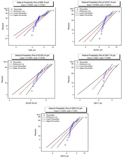 The rainfall events data for both IN and OUT differ from every bioretention. Rainfall events recorded for each bioretention area were as follows: EBF = 43, GEF1 = 15, GEF2 = 33, SCW1 = 31, and SCW2 = 26. These were processed using Weibull probability distribution in OriginPro 2021b software. Each parameter was plotted in which the X and Y-axis showed the actual and predicted cumulative percentage, respectively. A plotted figure for pH for bioretention IN is shown in Figure 3. The upper and lower percentiles were used as a basis of the fuzzified data. The fuzzified rainfall and parameter data were the results of the processed actual values gathered. This novel machine learning method uses software in determining fuzzy values which were used to a greater extent for analyzing systems or applications [21]. The figure shows plotted fuzzy values for pH bioretention IN. The X-axis shows the pH values and the Y-axis represents the Weibull cumulative probability expressed as a percentage. This is the graph result after the fuzzification of data in OriginPro software. The circles represent the percentiles of pH values IN of the different bioretentions. They are referenced with the red line and enclosed by upper and lower percentiles. These percentiles used a 95% confidence band and the results were the basis for the assigning of fuzzy values given the percentile range produced. There were 32 parameters, plus 1 decision rule and 5 bioretentions with 2 events (IN and OUT) having a total of 330 processed tables.
