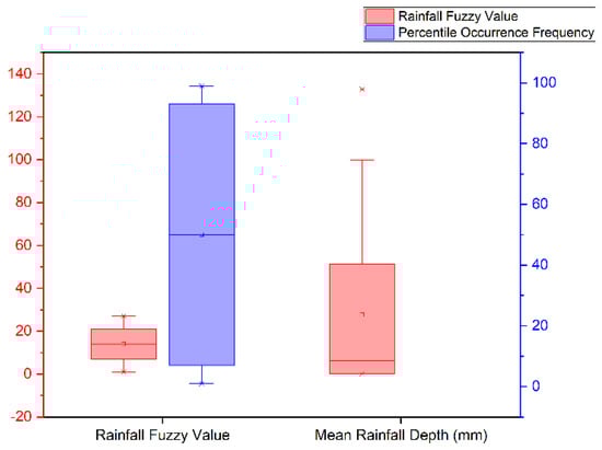 The various rain intensities and their respective percentile occurrence frequency are shown in Figure 4. This categorization of the mean rainfall was used for the fuzzy values concerning the water depth. These fuzzy values, 1 to 27, correlate to the five bioretention areas for both IN and OUT EMC events, capturing the entire 90th percentile of the total rainfall events as depicted in Table 4. With the thirty-year rainfall data, Weibull distribution was used to assign each of the fuzzified values to the 3337 rainfall occurrences, resulting in their identified relationship [27].