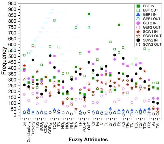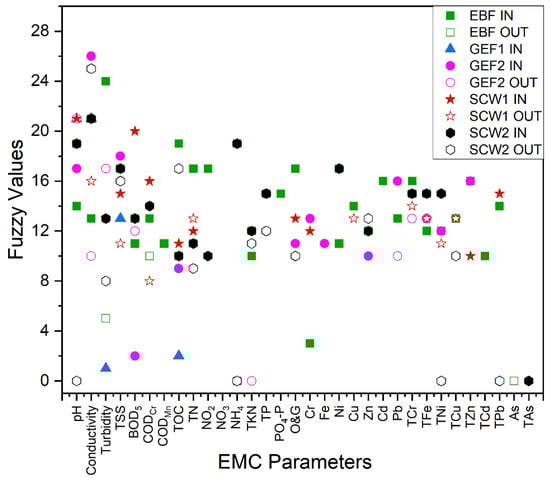 Figure 6 depicts the different EMC parameters and the corresponding significant fuzzy value. It is noticeable, that in this graph, the GEF1 bioretention OUT has no data, as no rules were optimized during the process. This means that the original set of rules will be retained for this type of bioretention. Additionally, also illustrated in the figure are the specific fuzzy values. There are different values for a certain EMC parameter that appeared after the process. As such, only the highest value that was below or equal to the 90th percentile [27] was validated for every EMC parameter. The specific fuzzy value of the parameters signifies the average value of EMC pollutants.