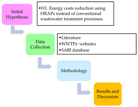 The objective of this research is to discuss the technological and management aspects leading to greater energy savings in WWTPs. Based on data on energy costs collected from the literature, WWTPs’ websites and SABI financial reports, a mixed methodology was used, which is one of the novelties of the work. The qualitative aspects consisted of a narrative analysis of the information about technologies, treated volumes and operating costs, while the quantitative approach involved calculating the specific energy consumption (kWh/m3), energy operating costs (EUR/m3) and energy operating costs per population equivalent (EUR/inhabitants). The energy cost of activated sludge-based technologies and HRAP technology from 11 Portuguese WWTPs and other international studies were compared. The most common biological processes for domestic or urban wastewater treatment in Portugal is activated sludge, followed by biological filters, stabilization ponds, anaerobic digestion (UASB) and constructed wetlands [25,26,27], which are operated by 45 companies. There are no HRAP processes operating in Portugal for wastewater treatment, and one of the other novelties of the work is to show the advantages of having such a system operating in the country. This study also calculated the energy cost savings by applying a savings ratio to the energy costs of activated sludge-based technologies calculated with data from previous literature.