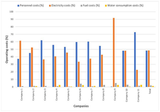 The main operating costs of the 11 Portuguese WWTPs were wages and electricity, representing 48.32% and 48.43% of total costs (Figure 2), respectively, for treated wastewater flowrates ranging 8392–496,618 m3/d and p.e. between 11,659 and 593,451 inhabitants. Gandiglio et al. [1] also found that electricity accounted for approximately 25–50% of operating costs. For populations between approximately 11.660 and 23.470 inhabitants, the personal costs were higher than the energy costs, reaching an equilibrium between these two costs for populations of approximately 57.170 inhabitants. However, for populations greater than 57.170 inhabitants, the results were inconsistent, as both higher values for electricity costs and higher values for personnel costs appeared with no correlation with population or volume growth. This inconsistency is related to the technologies used for wastewater treatment in the WWTPs of the 11 companies, with higher energy costs where more pumping equipment, turbines and compressors were used.