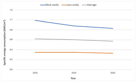 To evaluate the decrease in SEC in recent years (2018 to 2020), the minimum, maximum and average energy costs by year were calculated for the 11 WWTPs using activated sludge data (Figure 4.).