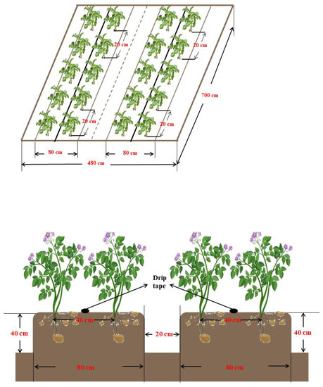 The potato variety ‘Qingshu 168’ was provided by the Qinghai Agricultural Science Research Institute of China Qinghai Agricultural Research Institute. In 2019, potatoes were sown on 14 April and harvested on 9 October; and in 2020, they were sown on 7 April and harvested on 15 September. The row spacing was 40 cm, and the plant spacing was 20 cm (Figure 1). A white plastic film (140 cm wide, 0.01 mm-thick; China Dongguan Shuotai Industrial Co., Ltd., Dongguan, China) covered two rows of potatoes with a planting density of 77,000 plants/ha. Drip irrigation was applied under the film with the irrigation pipe placed between two rows. Each treatment and control were repeated three times, and 140 potato plants were sown in each test plot. Each section covered 33.6 m2 (7 m × 4.8 m). There were two levels of water deficit: mild, with soil moisture at 55% to 65% of field capacity, and moderate, with soil moisture at 45% to 55% of field capacity. The soil moisture with conventional irrigation (CK) was 65% to 75% of field capacity. Each level of deficit was applied in each of the four growth stages of potato: seedling, tuber initiation, tuber bulking, and starch accumulation stages. Thus, there were eight total treatments: WD1: mild, seedling; WD2: mild, tuber initiation; WD3: mild, tuber bulking; WD4: mild, starch accumulation; WD5: moderate, seedling; WD6: moderate, tuber initiation; WD7: tuber bulking; WD8: starch accumulation (Table 1).