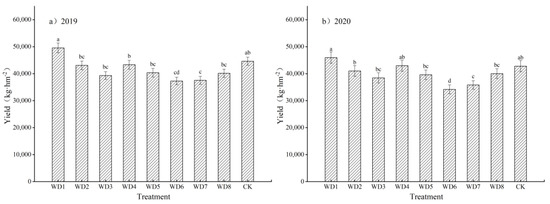 As a macroscopic effect of water regulation deficit on potato plants’ yield, combined with the average annual potato yield for both growing seasons (Figure 2), it was found that all treatments had an effect, compared to the control. The average annual yield of the seedling regulation deficit treatment WD1 was 47,766.96 kg·hm−2, an increase of 9.29% compared to the control, a significant difference (p < 0.05). The average annual yield of WD5 in the moderate water regulation deficit treatment at seedling stage was 39,981.89 kg·hm−2, a significant difference of 8.52% compared to the control. At the tuber initiation stage, the average annual yield of WD2 in the deficit treatment was 42,057.35 kg·hm−2, which was not significantly different from the control (p > 0.05), but the average annual yield of WD6 in the moderate water deficit treatment was 35,721.25 kg·hm−2, which was 18.27% lower than the control, a significant difference. At the tuber bulking stage, the average yields of WD3 and WD7 were 38,870.26 kg·hm−2 and 36,689.46 kg·hm−2, respectively, which were 11.07% and 16.06% lower than the control, with significant differences. During the starch accumulation period, the average annual yield of WD4 was 43,135.46 kg·hm−2, which was not significantly different from the control, while the average annual yield of WD8 was 40,080.83 kg·hm−2, which was significantly different from the control. The analysis of the effect of water loss irrigation on potato yields over two growing seasons found that water loss affected potato yields in all four growing seasons, but the extent of the effect varied between treatments. The degree of influence is in the following order: WD6 > WD7 > WD3 > WD1 > WD5 > WD8 > WD2 > WD4.