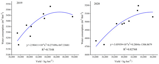 Relationship between potato yield and water consumption under drip irrigation and deficit regulation in the two growing seasons 2019 and 2020.