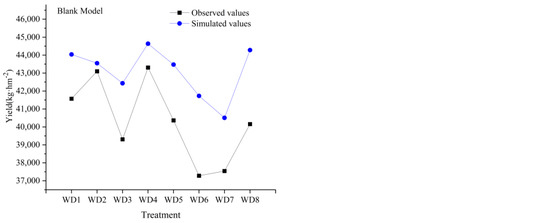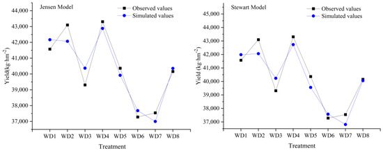 The sensitivity indices of the four models were validated and the Minhas model was found to have a sensitivity index greater than 1, which did not meet the criterion of less than 1 [7], so the model will be discarded. The sensitivity indices of the Jensen model are in the following order throughout the potato reproductive period: tuber bulking (0.9233) > tuber initiation (0.8205) > seedling stage (0.4517) > starch accumulation (0.3748), and there is no significant error between the measured and simulated values as found in Figure 4, thus conforming to the potato water production function. In the Blank model, with a sensitivity index in the following order: tuber bulking stage (0.4509) > starch accumulation stage (0.3700) > tuber initiation stage (0.3318) > seedling stage (0.1170), although the sensitivity index meets the criteria, there is a significant error between the measured and simulated values, so the model will be discarded. The sensitivity indices of the Stewart model for the four potato reproductive stages were in the following order: tuber bulking (0.9524) > tuber initiation (0.8392) > seedling (0.4855) > starch accumulation (0.4013), and there were no significant errors between the measured and simulated values, so they were consistent with the potato water production function. In summary, it was found that of the four models, only the multiplicative Jensen model and the additive Stewart model met the criteria.