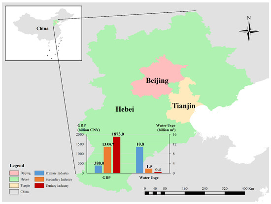 Hebei Province is located in the Haihe River Basin on the northern coast of China (Figure 1). The province is an important part of the “capital economic circle” of Beijing, Tianjin, and Hebei, and covers an area of 188,800 km2, with a GDP of CNY 3621 billion (USD 525 billion based on the 2020 exchange rate, with a similar conversion approach taken throughout the paper) and a population of 74.638 million in 2020. Hebei has a temperate monsoon climate. Hebei’s annual average water resource level is 20.469 billion m3. The water resource per capita is 274.24 m3, which is approximately one-seventh of China’s average and far less than the world average. Hebei Province has had to rely on the excessive use of groundwater to meet production and domestic water demands, and has become the province with the most serious groundwater overexploitation in China [26].
