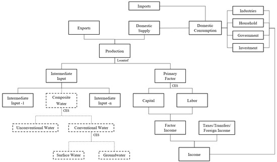 This study adopts a CGE model as the policy analysis tool, and establishes an extended water resources module. Surface water, groundwater, and unconventional water sources are integrated in the model as intermediate inputs, based on Hebei province’s water resource characteristics. Figure 2 provides a schematic of the model structure; the extended water resources module established in this study is represented by the dashed boxes [27].