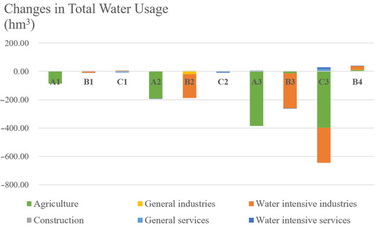 For structure adjustment scenarios, there are considerable water savings effects under scenarios A3 and B3. Scenario C3 results in a limited increase in total water usage compared to the sum of A3 and B3, indicating that the transfer of industries to the tertiary sectors can save water.