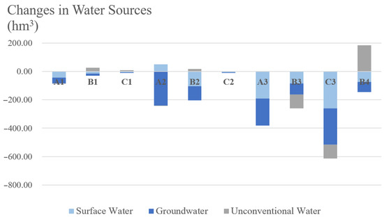 Table 4 and Figure 3 show the changes in total water usage across different industries in response to the different policy scenarios. The water usage of all listed sectors decreases in all scenarios, except for the water reuse scenario B4. For water price scenarios, the change in total water usage ranges from −85.75 to −1.88 hm3. For tech improvement scenarios, the change in total water usage ranges from −191.23 to −9.31 hm3. For structure adjustment scenarios, the change in total water usage ranges from −614.48 to −261.33 hm3. For the water reuse scenario, the total water usage increases by 39.18 hm3 and the unconventional water usage increases by 184.91 hm3.