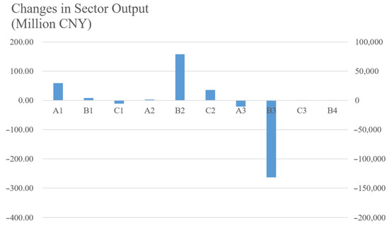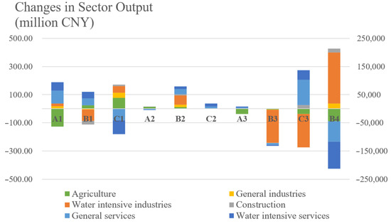 Table 6 and Figure 5 show the changes in sector output from different industries under the different policy scenarios, with the sector output generally varying by different policy objects and types. The sector output is ranked in ascending order (from least to most) as: B3, A3, C1, C3, B4, A2, B1, C2, A1, B2. For water price scenarios, the change in sector output ranges from −10.65 to 59.29 million CNY. For tech improvement scenarios, the change in sector output ranges from 3.31 to 158.09 million CNY. For structure adjustment scenarios, the change in sector output ranges from −131386 to 0 million CNY. For the water reuse scenario, the sector output increases by 1.14 million CNY.