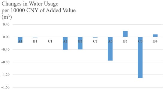 For the secondary sector, the change in total water usage is highest for B3, followed in descending order by B2, B1, and B4; the change in conventional water usage is highest for B2, followed in descending order by B3, B4, and B1. Scenario B1′s water-saving effect is very limited, with the highest change in added value seen in B2, followed by B1 and B3. Scenario B3 has a greater impact on industrial output and should not be used alone. In general, Scenario B2 is most appropriate for the secondary sector, while scenario B4 is appropriate as a supplementary measure. Scenario B3 has a greater negative impact on industrial output and should not be adopted alone.