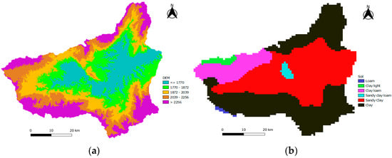 The SWAT model needs topography, LULC, soil, and daily weather data to simulate hydrologic processes. Digital elevation model (DEM) represents watershed topography attained from the Shuttle Radar Topography Mission of the US Geological Survey (Figure 1a). The soil data were acquired from Food and Agriculture Organization (FAO), Harmonized World Soil Database (HWSD) []. HWSD Viewer Version 1.21 [] was used to generate a code for soil properties. Different types of soil texture and physical-chemical properties of soils are required for SWAT simulations [,]. The dominant soil groups were identified, the soil map was attached to the soil database (Figure 1b), and a lookup table was prepared that links the soil class and input soil map to the SWAT model database.