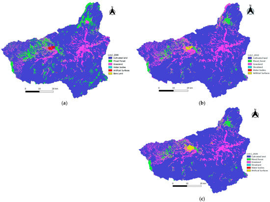 The study area LULC maps of (a) 2000, (b) 2010, (c) 2020.