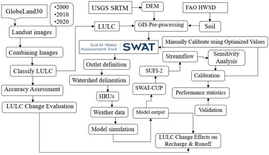 Land and water resources are dynamically hindered by uncertainties of climate and land use land cover (LULC) changes, aggravating the water crisis worldwide [,]. Inappropriate exploitation and poor management systems increasingly threaten land and water resources, changing the natural landscapes for human use [,,]. Examining the possible effects of LULC change on the hydrologic cycle under natural and human activities is required to manage available resources properly []. However, LULC change responses to environmental and socio-economic drivers continue to be a significant scientific hindrance in assessing its effect on water availability []. In different climate regions, groundwater is the main fresh water supply; its utilization and management are thoroughly associated with the Sustainable Development Goals [,,]. Conversely, in most African countries, the salient use of groundwater for domestic and agricultural purposes significantly affects groundwater recharge and food security [,,].