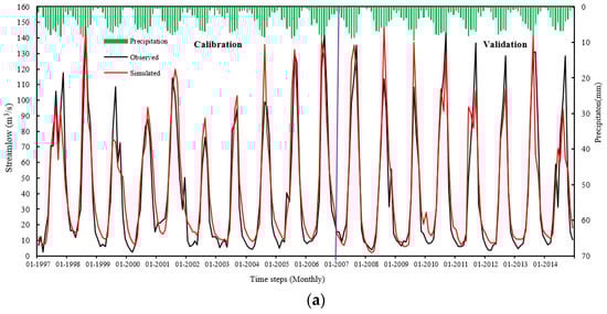Statistical values (Table 2) indicate that objective functions were acceptable for model evaluation [,]. Several authors [,,,,,] calibrated the SWAT model in other Ethiopian watersheds. They mainly reported statistical performance indicators of R2, NSE, and PBIAS based on [], comparable with the present findings. The resulting statistics were comparable to other worldwide studies [,,,,,,,]. The SURQ relies upon overall precipitation, evaporation, and soil water storage. The most considerable SURQ is derived from high precipitation and elevation. The most increased flows are typical from July to September, and the lowest flows occur during February and May. A regular correlation between rainfall and runoff was observed (Figure 4a–c). Accordingly, the applicability of the simulated SWAT model was found to be in agreement with regional and global studies and was reasonably acceptable in the Gilgel Gibe watershed.