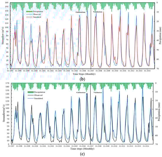 Hydrograph of measured and simulated flow during calibration and validation of (a) 2000, (b) 2010, and (c) 2020 reference periods.