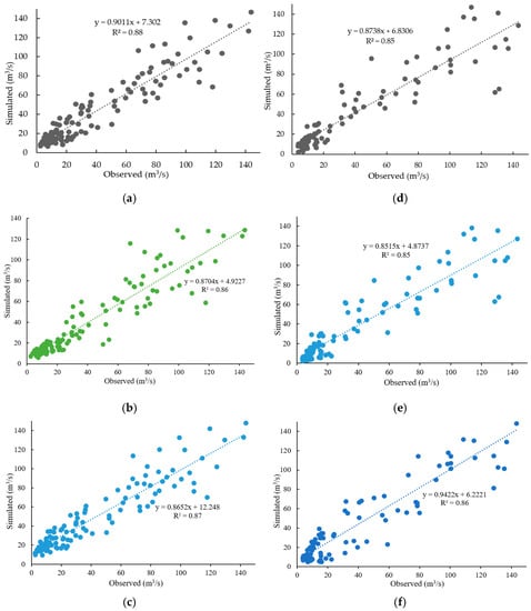 Scatter plot of measured and simulated flow during calibration (a–c); validation (d–f) for LULC-2000, -2010, and -2020 simulations, respectively.