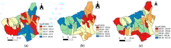 Spatiotemporal patterns of surface runoff during (a) 2000, (b) 2010, and (c) 2020 LULC simulation periods.