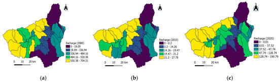 Spatiotemporal pattern of groundwater recharge: (a) 2000, (b) 2010, and (c) 2020 reference LULC periods.