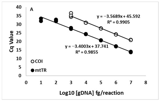 Additionally, for ZMs, the calculated LOD was determined to be two orders of magnitude lower for the mtTR assay, and LOQ was determined to be one order of magnitude lower for the mtTR assay compared to the COI assay (Table 1). For QMs, the calculated LOD was determined to be one order of magnitude lower for the mtTR assay compared to the COI assay (Table 1).