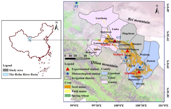 The Zhangye Basin, a typical arid river basin, is the largest seed maize production base in China [49]. The study area is composed of three administrative counties and subdivided into 21 irrigation districts (Figure 1). The climate is typically arid with low precipitation of approximately 120 mm yr−1 and high potential ET of 1200 mm yr−1 [50]. The major types of land use are cultivated land and Gobi Desert, with the major soil textures of loam and silty loam.