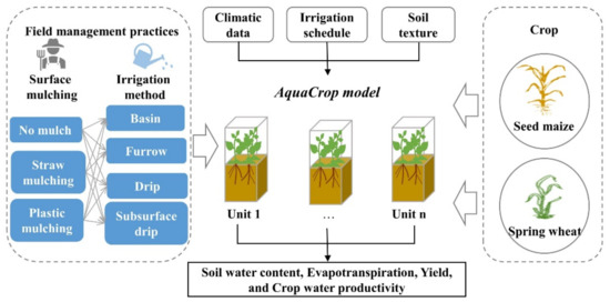 An important feature of the AquaCrop model is the consideration of agricultural management practices that affect the interaction between crop growth and the soil environment. The practices are composed of field management, such as mulching, and irrigation management, such as drip and subsurface drip irrigation.