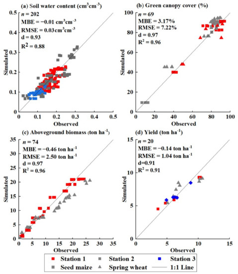 where is Willmott’s index of agreement; and represent the mean bias error and the root mean square error, respectively, and is the coefficient of determination. Oi and Pi are the observed and simulated values, respectively; and are the mean values of the observations and simulations, respectively; and n is the number of observed/simulated values.