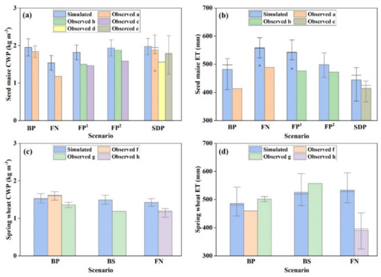 Comparisons between the observed and simulated seed maize (a) CWP and (b) ET and spring wheat (c) CWP and (d) ET under different scenarios. (BP, FN, FP, BS, and SDP present basin irrigation with plastic mulching, furrow irrigation with no mulching, furrow irrigation with plastic mulching, basin irrigation with straw mulching, and subsurface drip irrigation with plastic mulching, respectively. FP1 and FP2 present different coverage of plastic mulching, respectively. The observed values a to h are collected from a Zhang [73], b Zhao et al. [74], c Zhang et al. [75], d He et al. [76], e Zheng et al. [77], f Wang [78], g Ma et al. [59], and h Ma et al. [60].