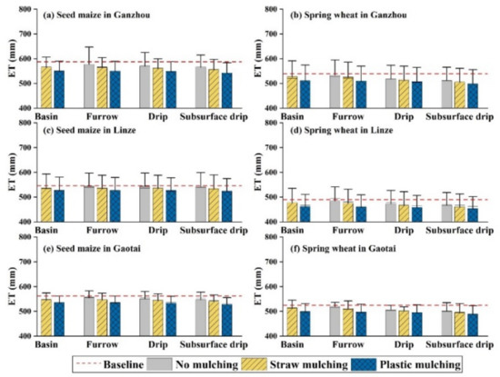 With plastic mulching, the negative effects of irrigation methods on ET ranked from subsurface drip irrigation to drip irrigation and to furrow irrigation. The combination of subsurface drip irrigation and plastic mulching had the largest reduction in ET for both seed maize (8.1%) and spring wheat (8.0%). The reductions in seed maize ET ranged from 68.0 mm under subsurface drip irrigation and plastic mulching to 45.0 mm under basin irrigation and straw mulching. The corresponding reduction values of spring wheat ET were 42.4 mm and 11.2 mm, respectively. The difference in ET reduction between seed maize and spring wheat could be attributed to different crop types (C3 or C4 plants) and the longer crop-growth period of seed maize in the study area.