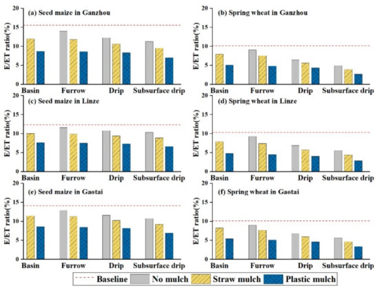 Under furrow irrigation, the average seed maize E/ET ratios of straw mulching and plastic mulching were 10.9% and 8.2%, respectively. Compared with no mulching, straw mulching and plastic mulching under drip irrigation decreased the seed maize E/ET ratios by 12.7% and 30.5%, respectively. The corresponding decreases under subsurface drip irrigation were 15.0% and 36.4%, respectively. For spring wheat, the average E/ET ratios under no mulching, straw mulching, and plastic mulching with drip irrigation were 6.7%, 5.7%, and 4.3%, respectively. It can be seen that for the same irrigation method, the E/ET ratio decreased under soil mulching, and plastic mulching had a more obvious effect than straw mulching due to the difference in the reduction in soil evaporation.
