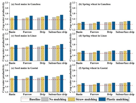 Crop water productivity (kg m−3) of seed maize in (a) Ganzhou, (c) Linze and (e) Gaotai, and spring wheat in (b) Ganzhou, (d) Linze and (f) Gaotai under different combinations of management practices. (Baseline represents the combination of no mulching and basin irrigation).