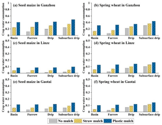 In addition, the seed maize CWP increase by drip irrigation at larger farmland scales (15% on average) was less than that at small zone scales (>20%) found by Wang et al. [82]. This could help explain why the positive effects of drip irrigation on CWP at the basin scale are not as obvious as those of previous site-scale studies. The effect of different irrigation methods on the improvement in CWP was not as good as that of soil mulching practices. Plastic mulching was better at increasing the CWP than straw mulching. The difference could be attributed to the larger reduction in ET and better improvement in the soil environment resulting in higher yield by plastic mulching, as discussed before.