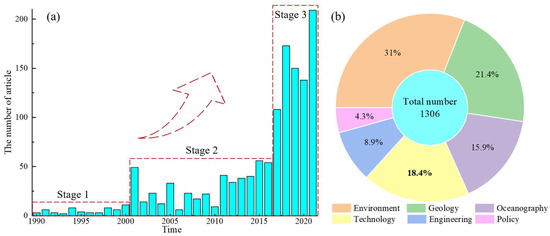 Using the Web of Science core database, we searched the literature collected from 1 January 1990 to 31 December 2021 using the keyword “deep-sea mining”. The results are shown in Figure 1. A total of 1306 articles have been published in the past 31 years, and the overall number of articles published each year has increased with time. The trend for the number of articles published annually can be divided into three stages: The first stage was between 1990 and 2000, when research was at a low point, with an annual publication volume of approximately 10 articles. The second stage was between 2001 and 2016, in which the annual publication volume fluctuated between 20 and 50 articles. The third stage was from 2017 to 2021, during which the annual publication volume increased significantly, between 108 and 209 articles. The total publication volume during this stage was 1.5 times the total number of publications in 1990–2016, marking the renewed interest of researchers in deep-sea mining. All of the published articles could be divided into six categories according to discipline: environment, geology, technology, engineering, oceanography and policy. Environment-related research accounted for the largest proportion, followed by geological research. Over 70% of the articles focused on environmental, geological and mining technology issues related to deep-sea mining.