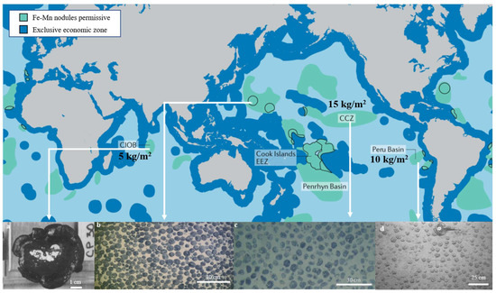 Deep-sea polymetallic nodules are generally distributed in abyssal plains with a water depth of 4000–6000 m. Figure 3 shows the global location of deep-sea polymetallic nodule exploration areas and exclusive economic zones. The CCZ is most widely distributed in the eastern Pacific, where the average abundance of polymetallic nodules is approximately 15 kg/m2 [4]. It is also distributed in the Indian Ocean, Cook Islands, and Peru Basin [3,4,5,6,7,8,9,10,11,12,13,14,15,16,17,18,19,20,21,22,23,24,25,26,27,28,29,30,31,32,33,34,35,36,37,38,39], with an average abundance of 5 kg/m2, 5 kg/m2, and 10 kg/m2, respectively [40]. In addition, Figure 3a–d shows the morphological characteristics of polymetallic nodules and their occurrence state on the seafloor. Polymetallic nodules occur on the surface of the seabed, and are mostly spherical, although other shapes exist such as rods, strips, and cauliflowers [41]. The diameter of the nodules is usually between 1 and 20 cm, the density is between 1.7 and 3 g/cm3, and the burial depth is generally not more than 30 cm, though there also exists a small quantity of polymetallic nodules buried in sediments deeper than 30 cm [42].