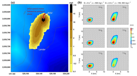 (a) The distribution of suspended solids at a height of 1.5 m from the seabed predicted by the model 13 min after disturbance [27]; (b) the area and thickness of resuspended particle sediments four days after particle disturbance for three different particle sizes under different simulated bottom-flow velocities [114].