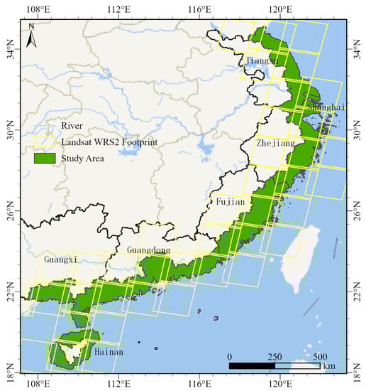 The southeast coast of China stretches from Jiangsu in the north to Hainan in the south, Guangxi in the west, and Taiwan in the east, which consists of eight provinces, two special administrative regions, one autonomous region, and one municipality directly under the central government. The north–south span is about 1800 km, and the east–west span is about 1500 km. The region has abundant water resources and a developed river network, forming coastal plains, such as the Yangtze River Delta and Pearl River Delta, as well as abundant tidal flats and shallow water bays. Therefore, it offers a distinct advantage in the large-scale construction of aquaculture ponds. The southeast coastal area has a long coastline. Jiangsu, Zhejiang, Fujian, and Guangdong in the region are famous aquatic provinces in China. In 2020, the total area of fishery farming was 27,028.80 km2, accounting for 38.41% of China’s fishery farming. The total output value of the fishery economy was 1650.356 billion yuan, accounting for 59.92% of the national total output value of the fishery economy, among which, the output value of fishery breeding was 611.337 billion yuan, accounting for 45.23% of the national total output value of the fishery economy. The research area included the coastal cities of five provinces (Jiangsu, Zhejiang, Fujian, Guangdong, and Guangxi), one municipality directly under the central government (Shanghai), and the main island of Hainan Island, which has coastal zone breeding conditions in southeast China (Figure 1). We conducted aquaculture pond automatic recognition and extraction algorithm research, and analyzed the spatial agglomeration features of this study area.