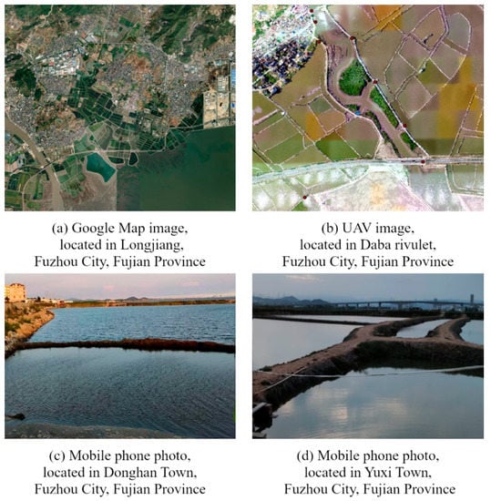 In this study, the extracted aquaculture pond refers to artificial or semi-artificial open ponds that are distributed in coastal areas for aquaculture purposes. Ponds are bound by roads or embankments with different widths, which, generally, are presented in the form of regular or irregular grids in remote sensing images. Aquaculture pond water consists of brackish or freshwater, and its spectral characteristics are similar to a water body. Google images of typical aquaculture ponds and their corresponding field survey photos are shown in Figure 2.