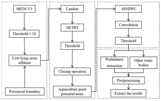 In this study, we proposed an automatic extraction method for aquaculture ponds in coastal waters based on image spectral information, spatial features, and morphological operation. This method combined two water spectral indices (MCIWI and MNDWI) with space convolution to achieve the layered recognition of the land–water boundary and grid characteristics of aquaculture ponds. Replacing individual extraction with overall identification of aquaculture ponds has not only improved the identification accuracy, but also conformed to the attributes of aquaculture land use type. The results of the application in the southeast coastal region of China reflected the high precision and reliability of the extraction method.