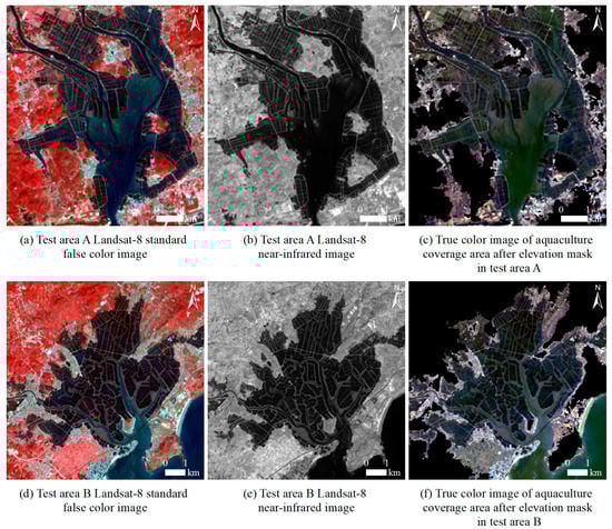 Because offshore aquaculture ponds are distributed primarily along the gentle coastal zone, SRTM elevation data could be used to mask the inland higher altitude areas, with 10 m as the threshold [42]. As a result, we could determine the potential coverage area of the distribution of the aquaculture ponds. The objects acquired through this step are composed of non-water information (such as buildings, vegetation, or tidal flats) in gentle coastal zones, as well as water information, such as the surface of aquaculture ponds or seawater. As shown in Figure 4, test areas A and B are composed mainly of the central water system and the aquaculture ponds attached to the water system, and the surrounding areas are covered with buildings, bare soil, and vegetation. After the SRTM elevation threshold mask, only the hydrographic net, the water surface of aquaculture ponds, and a small part of the low-elevation bare soil, vegetation, and building information were reserved (Figure 4c,f).
