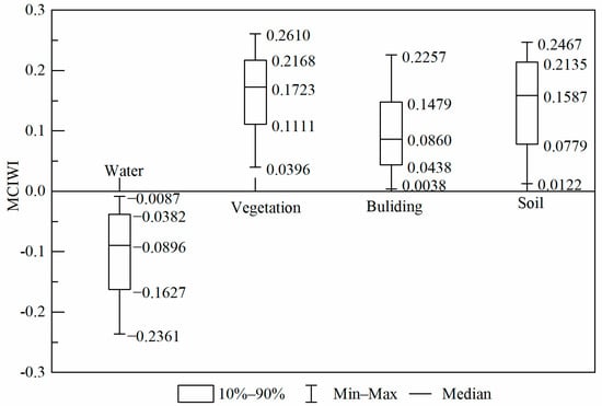 Figure 5 shows the ability of the MCIWI index to distinguish between water body and non-water-body information in the study area. We selected 200 random points for each of the surface cover types of the coastal zone, such as water bodies, vegetation, buildings, and bare soil, and we extracted and counted the MCIWI values of random points. The MCIWI values of most water bodies were in the range of (−1, 0). In contrast, MCIWI values of non-water-body information, such as vegetation, buildings, and bare soil, were all greater than 0, which reflected the separability and feasibility of automatic threshold segmentation from water information.